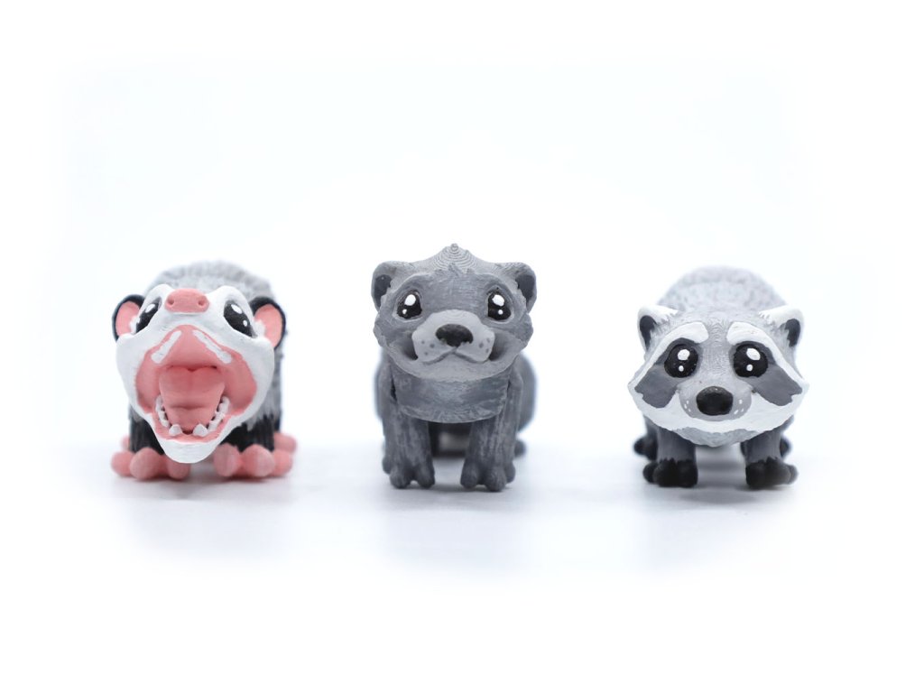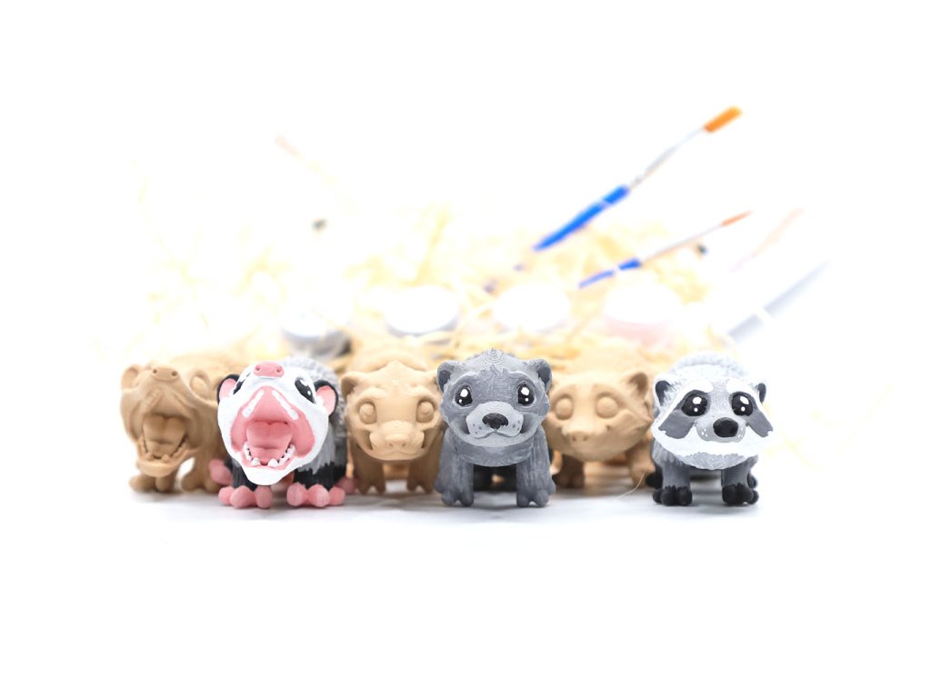 Mini zvířátka Creative Friends Vačice a Fretka a Mýval v sadě s barvami, štětci, návody a kroužky na klíče.