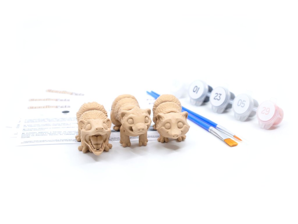 V balení naleznete: plochý a kulatý štětec, 3x kroužek na klíče, 5x3ml kvalitních akrylových barev v odstínech, které jsou k namalování zvířátek potřeba, návod k namalování ke každému zvířátku a samozřejmě také samotný model Vačice, Fretky i Mývala.